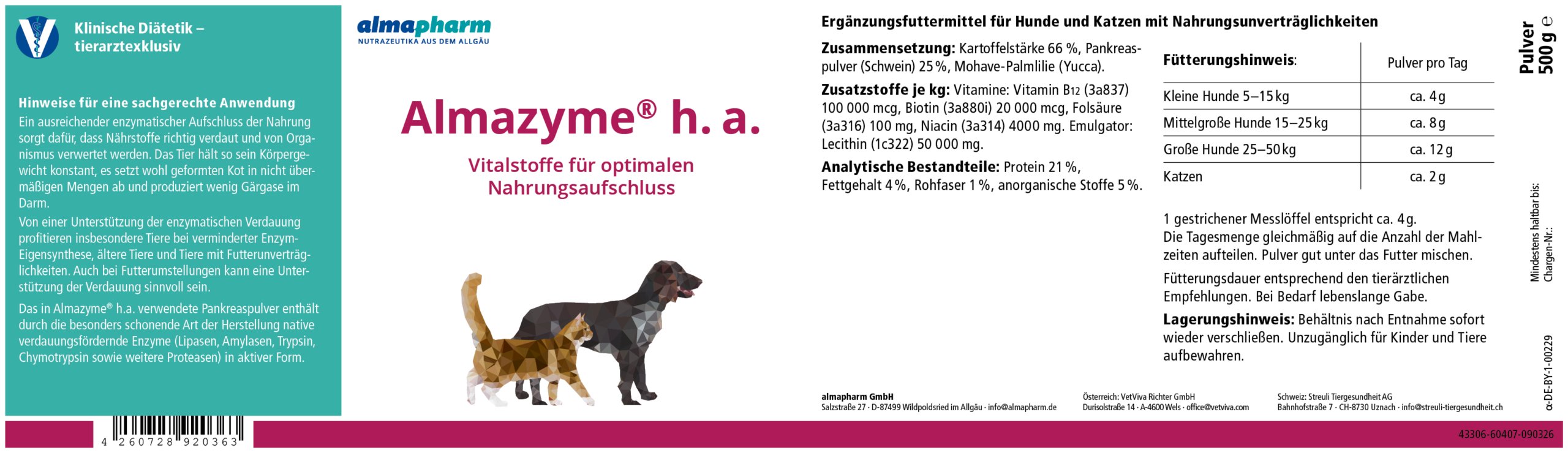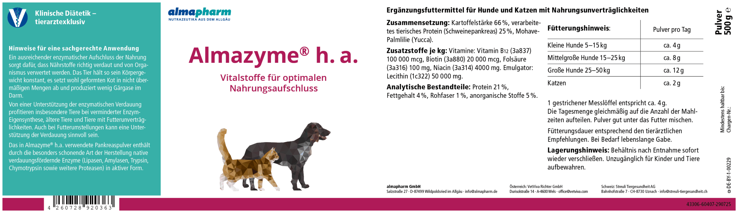 Ergänzungsfuttermittel für Hunde und Katzen mit Nahrungsunverträglichkeiten. Vitalstoffe für optimalen Nahrungsaufschluss. Für weitere Informationen zu analytischen Bestandteilen, Zusatzstoffen, Zusammensetzungen und Fütterungshinweisen siehe Etikett.