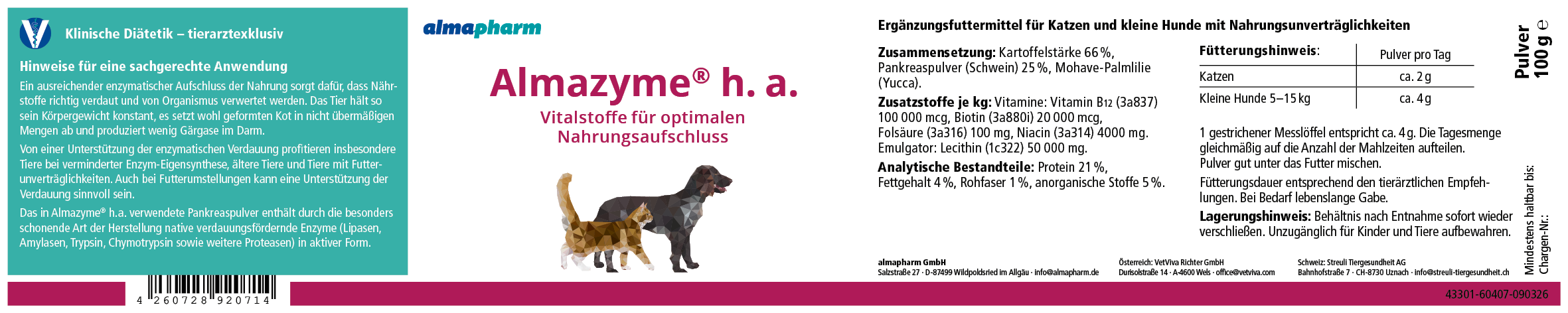 Ergänzungsfuttermittel für Katzen und kleine Hunde mit Nahrungsunverträglichkeiten. Vitalstoffe für optimalen Nahrungsaufschluss. Für weitere Informationen zu analytischen Bestandteilen, Zusatzstoffen, Zusammensetzungen und Fütterungshinweisen siehe Etikett.