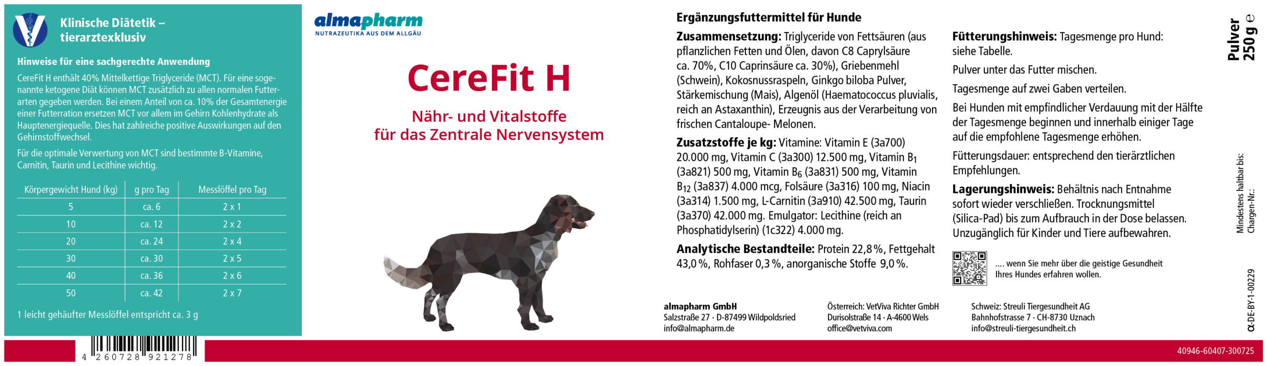 Ergänzungsfuttermittel für Hunde. Nähr- und Vitalstoffe für das Zentrale Nervensystem. Für weitere Informationen zu analytischen Bestandteilen, Zusatzstoffen, Zusammensetzungen und Fütterungshinweisen siehe Etikett.