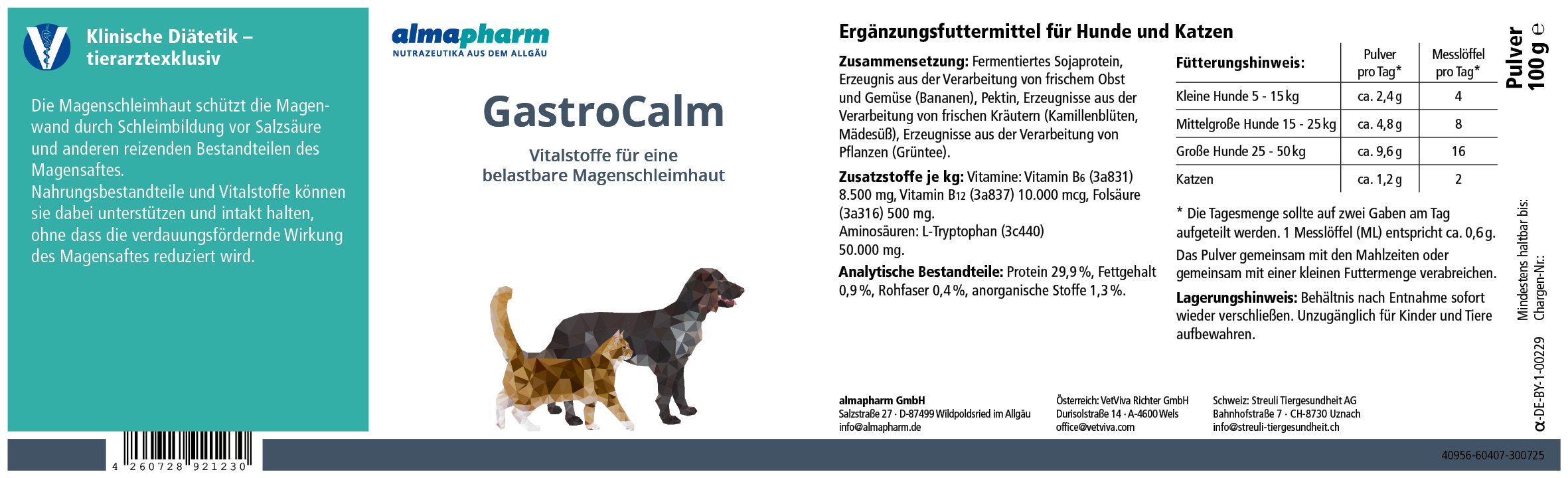 Ergänzungsfuttermittel für Hunde und Katzen Vitalstoffe für eine belastbare Magenschleimhaut Für weitere Informationen zu analytischen Bestandteilen, Zusatzstoffen, Zusammensetzungen und Fütterungshinweisen siehe Etikett.